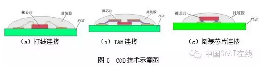 与COB类似的电路组装技术还有COF(Chip On Film,柔性电路板上芯片)和于COG(Chip On Glass,玻璃板上芯片)。前者用于柔性印制电路板电路中,后者液晶显示面板等产品制造中。其互连方式也如图1所示的方式。