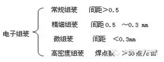 这种说法把组装技术按照工艺精度分为几种类型,即根据集成电路引线间距尺寸或元器件相互距离,以及基板单位面积上焊点数目分类:
