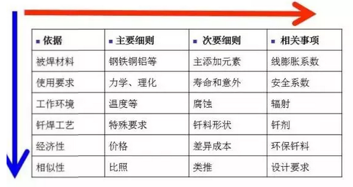 上图是根据生产实践总结出的钎料与母材的匹配优先选用的顺序。